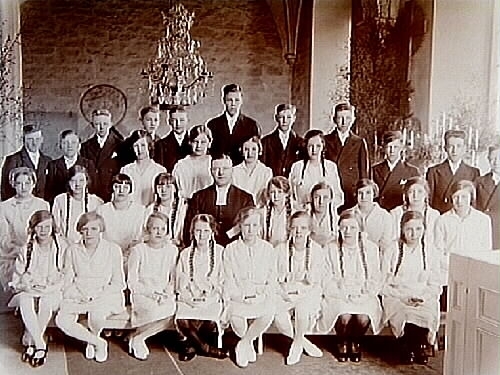 Konfirmander, 21 flickor, 11 pojkar och prästen i Sköllersta kyrkan.