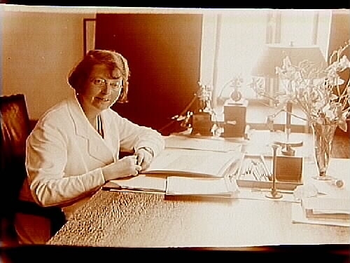 Titel: Garphytte Sanatorium, interiör, en kvinna vid sitt skrivbord. Doktor Klein
