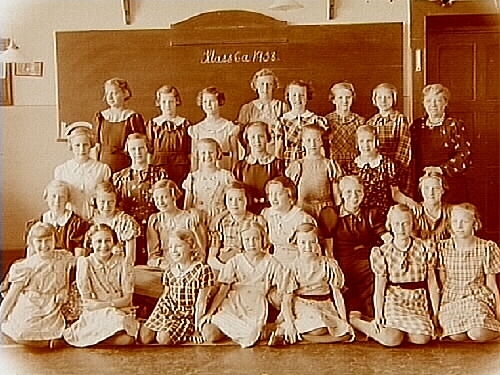 Titel: Olaus Petriskolan, klassrumsinteriör, 27 flickor med lärarinna fröken Elin Hellman, klass 6a, sal 11.