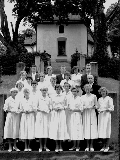 Konfirmander, 17 flickor, 3 pojkar och kyrkoherde Gösta Sköldebrand.