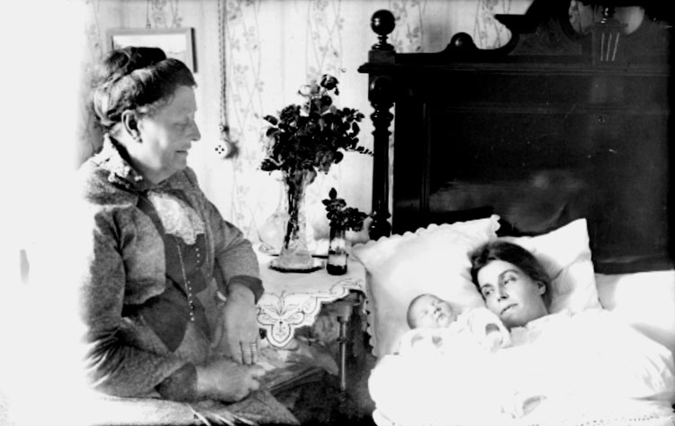 Yngre kvinna liggande i säng med ett spädbarn bredvid sig. Äldre kvinna sittande bredvid sängen