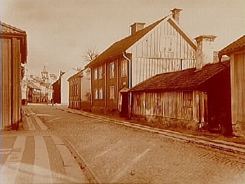 Träbebyggelse, en och en halv och tvåvånings bostadshus.