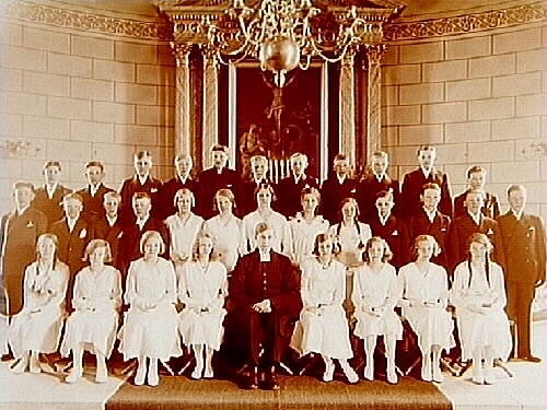 Konfirmander, 13 flickor, 19 pojkar och pastor Berger i kyrkorummet.