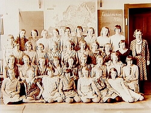Olaus Petriskolan, klassrumsinteriör, 35 skolflickor med lärarinna fröken Rut Videll, sal 21.