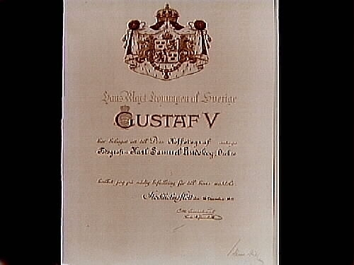Diplom med texten: "Hans maj:t Konungen av Sverige Gustaf V har behagat att till Dess Hoffotograf antaga Fotografen Karl Samuel Lindskog, Örebro. Hvilket jag på nådig befallning får till bevis meddela. Stockholms Slott, den 16 december 1911". Undertecknat av Förste Hofmarskalk.