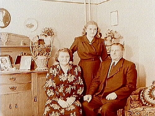 Rumsinteriör, familjegrupp tre personer.