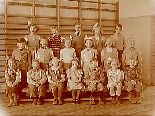 Engelbrektsskolan, klassrumsinteriör, 18 skolbarn med lärarinna fru Agda Borgell, klass 2ad, sal 3-5.