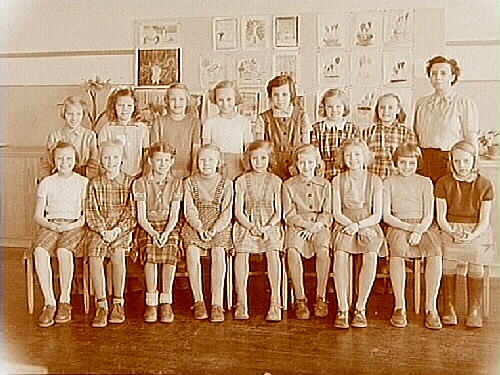 Olaus Petriskolan, klassrumsinteriör, 16 flickor med lärarinna fröken Maja Karlsson, klass 4b, sal 23.