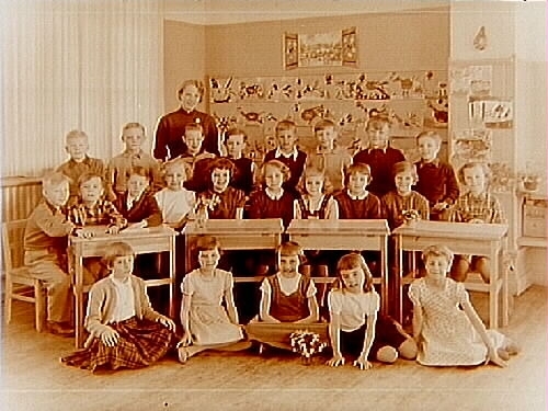 Vasaskolan, klassrumsinteriör, 23 skolbarn med lärarinna fröken Inger Annby, klass 2u, sal 29.
