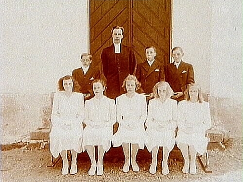 8 konfirmander, 5 flickor, 3 pojkar och prästen.