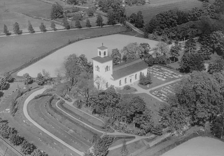 Flygfoto över Vintrosa kyrka.