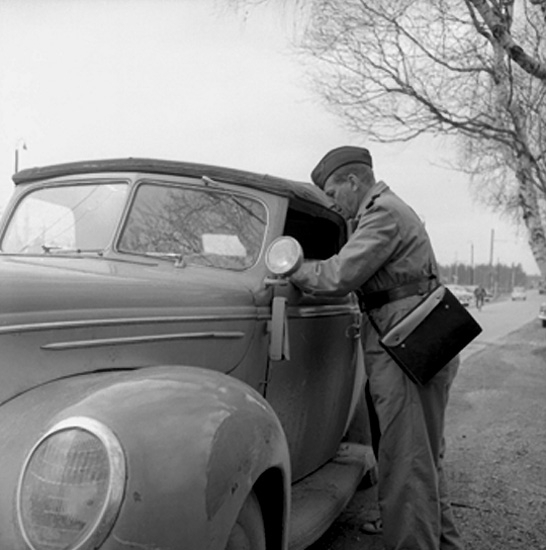 En trafikpolis vid bilen.