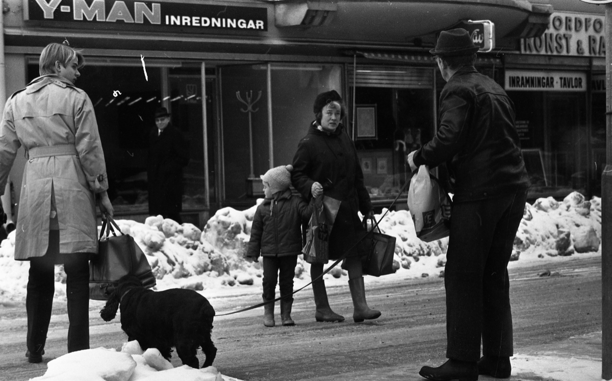 Gående kvinna med barn och två manliga gångtraikanter passerar på snöplogad gata i Örebro.