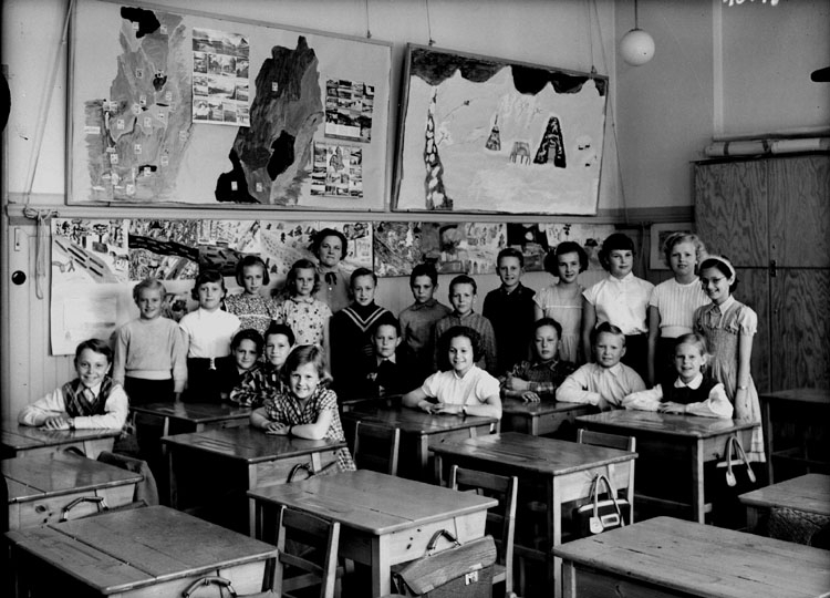 Rynninge skola, klassrumsinteriör, 21 skolbarn med lärarinna fru Maj Restadh.