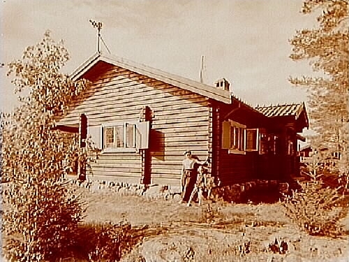 Envånings knuttimrad sommarvilla med inredd vind, 2 personer framför villan.
