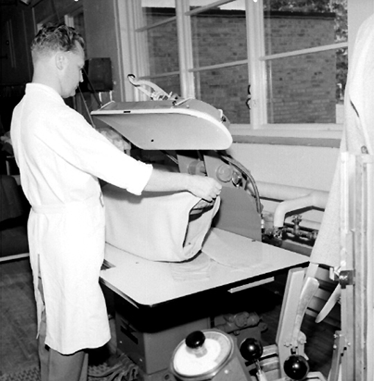 Titel: Bergeå Kemiska, kemtvätt, interiör, en man.