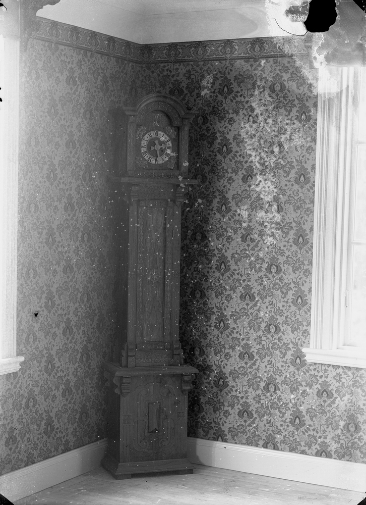 Rumsinteriör. Golvur förfärdigat av Gustaf Ferdinand Hallberg. Golvuret finns nu (2016) hos Anita och Sören Johansson vid Norra Hyddan i Svennevad.