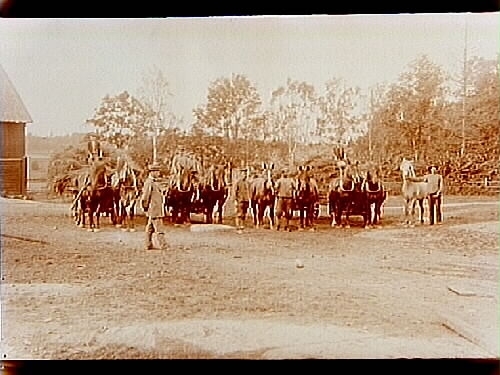 8 hästar spända för 4 höskrindor och en häst stående vid sidan.