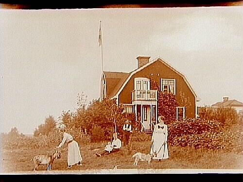 Tvåvånings bostadshus med brutet tak, takhuv, liten balkong och förstubro.