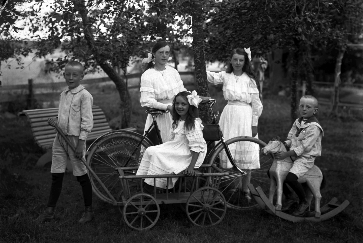 Fem barn vid en cykel, en av dem sitter i kärra, en pojke på gunghästen.