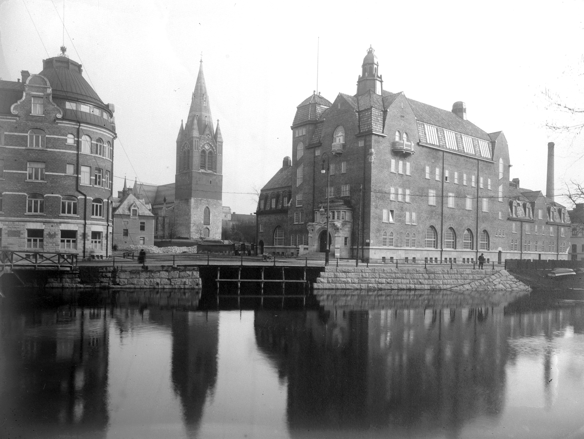 Titel: Telegrafhuset. Från vänster på bilden syns den gamla träbron, Elverket, Församlingshuset, Nikolaikyrkan och Telegrafhuset.