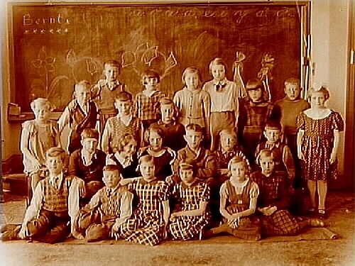 Titel: Engelbrektsskolan, klassrumsinteriör, 22 skolbarn med lärarinna fröken Elly Söderlund, sal 14.