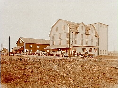 Nya Kvarnen och magasinet med två lastbilar och tre hästskjutsar.