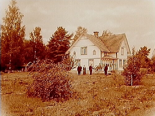 En och en halvvånings bostadshus, vinkelbyggt med glasad veranda, fyra personer framför huset.