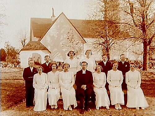 Konfirmander, 8 flickor, 4 pojkar och pastor Hagman i Mosås.