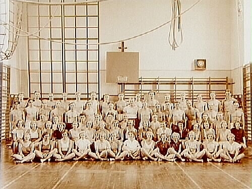 68 gymnaster och frisksportare i Engelbrektsskolans gymnastiksal.