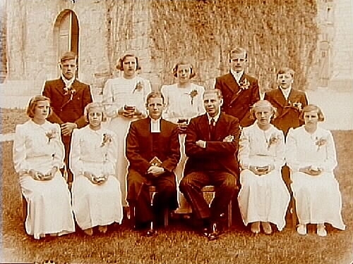 Dövstumma konfirmander, sex flickor, tre pojkar och dövstumspastor Karl-Åke Areskog.