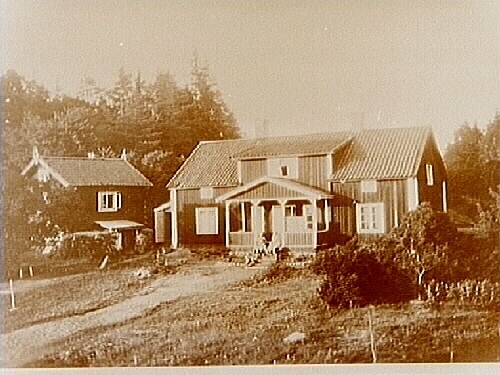 En och en halvvånings bostadshus med frontespis och stor veranda, en flygelbyggnad.