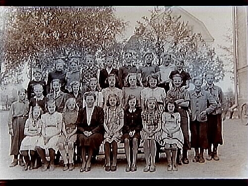 Almby Östra skola, 27 skolbarn med lärarinna fröken Karin Larsson, klass 6.