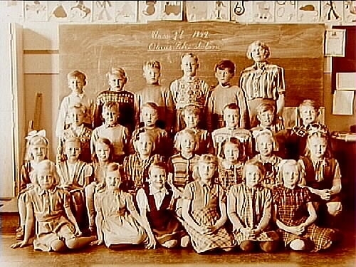 Olaus Petriskolan, klassrumsinteriör, 26 skolbarn med lärarinna fröken Edla Andersson, klass 2B, sal 17.