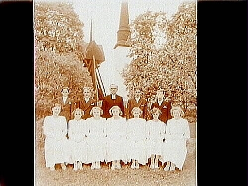 11 konfirmander, 7 flickor, 4 pojkar med kyrkoherde Johansson.