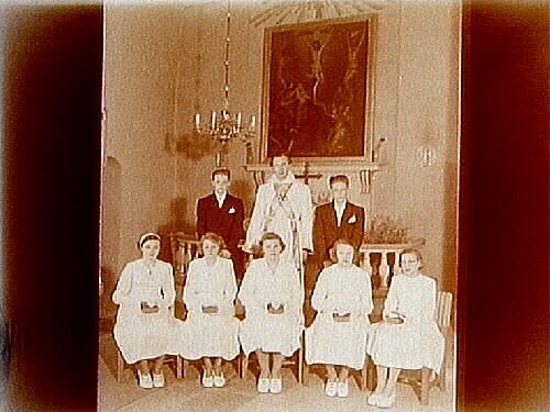 Konfirmander, fem flickor, två pojkar och pastor Klasson.