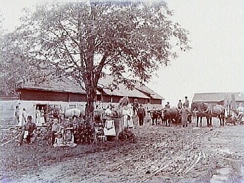 Skördemaskin förspänd till 2 hästar, 2 oxar förspända för vagn och 2 hästar med hölass.
