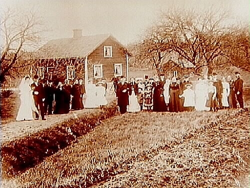 Bröllop, brudpar och bröllopsgäster. Bruden helt i vitt, brudgummen i mörk kostym och plommonstop.