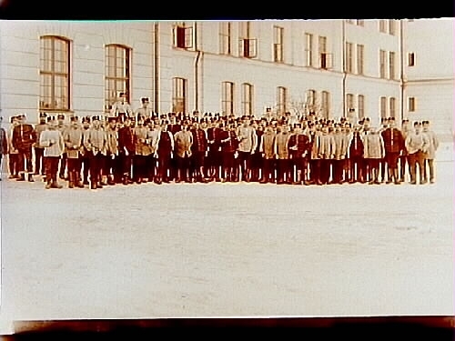 Soldatgrupp utanför kasern, ca 60 soldater.