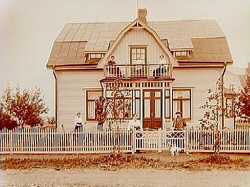 En och en halvvånings villa med frontespis, balkong, glasad veranda. 5 personer och en hund framför villan.