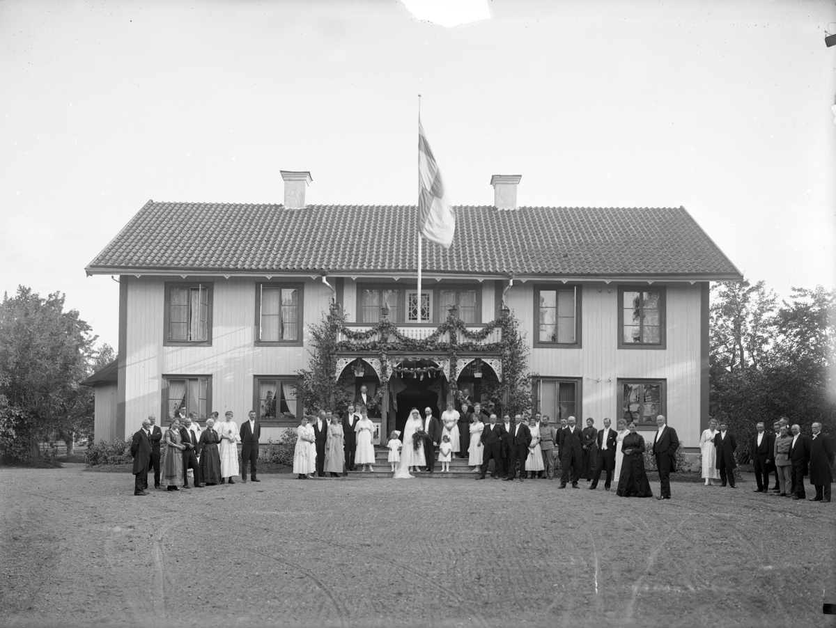Bröllop. Brudpar med brudnäbbar på trappan. Bröllopsgäster framför huset.