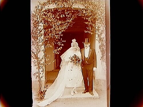 Brudpar, bruden helt i vitt, lång slöja, krona.