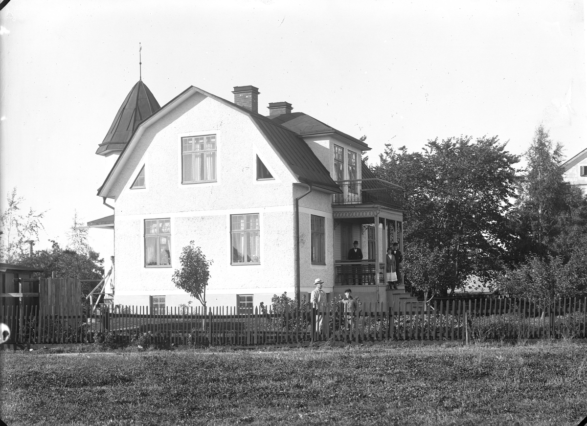En och en halvvånings bostadshus med frontespis, torn med tornhuv, balkong, förstukvist, köksingång.