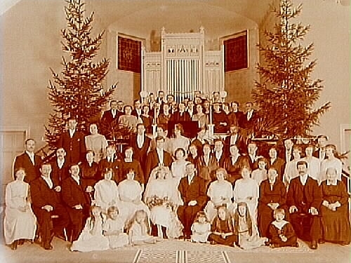 Bröllop. Brudpar och bröllopsgäster. Bruden helt i vitt med lång slöja, brudbukett, myrtenkrona, brudgummen i bonjour. Juldagen.