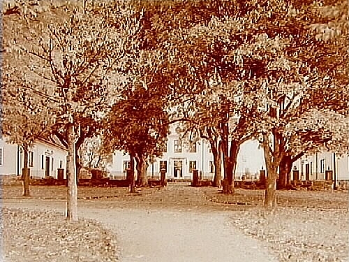 Götarsviks herrgård, tvåvånings herrgårdsbyggnad med frontespis, två takhuvar, balkong och veranda.