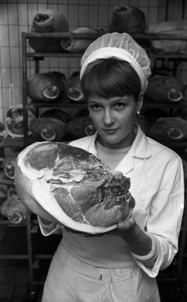 Kvinna visar upp en julskinka. Bakom henne står en vagn med hyllor med flera julskinkor.
