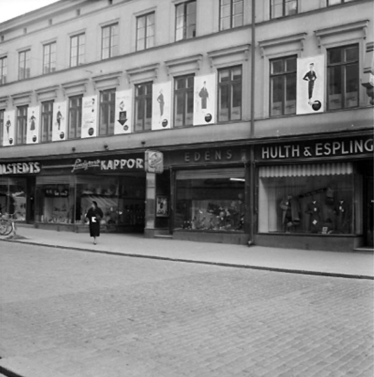 Tvåvånings bostadshus med affärer i gatuplanet.