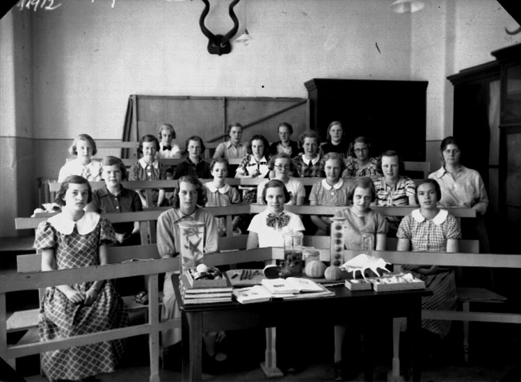 Kommunala Flickskolan, klassrumsinteriör, 20 flickor med lärarinna fröken Gillner.
