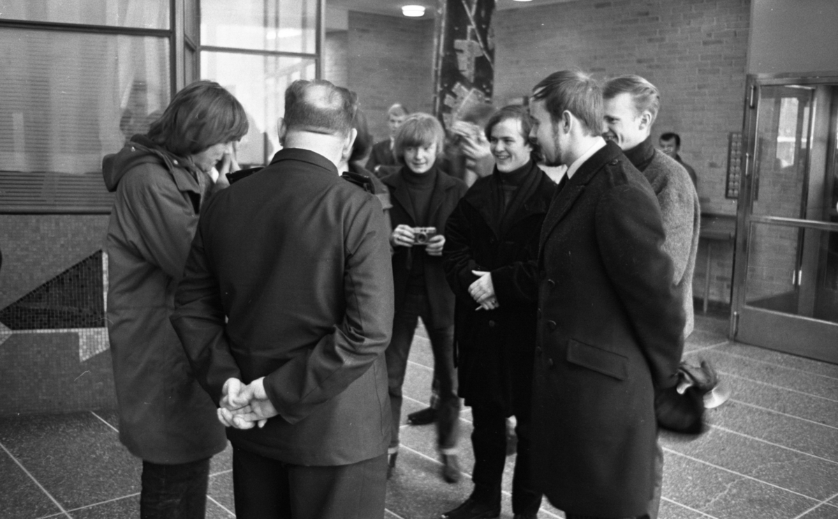 Mitt på golvet inne på polisstationen står medlemmar ur musikgruppen Shanes och polismän och samtalar. En av de unga männen har en kamera i handen.