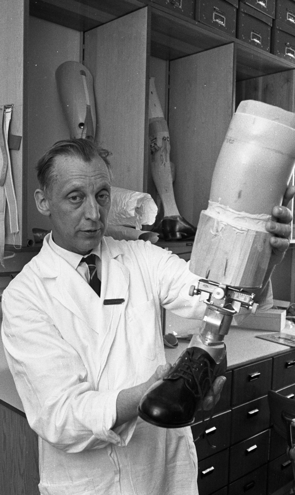 En man vid namn Holmgren i vit rock, skjorta och slips visar fram en benprotes. Bakom honom skymtar hyllor fyllda med benproteser. En massa lådor syns även till höger i bild.